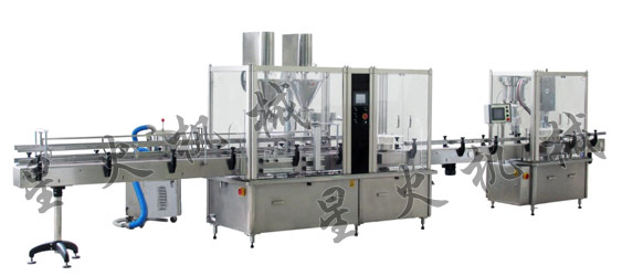 粉末灌裝旋蓋生產線集粉劑充填旋蓋、電磁感應封口、雙面貼標、噴碼等功能為一體,自動完成粉劑的充填包裝過程。該聯動線為顆粒粉狀等物料自動計量灌裝旋蓋貼標生產線,具有自動送罐、上料、計量、灌裝、旋蓋、封口、貼標、噴印等功能。所有與物料接觸部分均為不銹鋼,整線由PLC控制,伺服電機計量,具有精度高、速度快、貼標精確、噴碼清晰準確等優點,適用于大多數粉末產品和特別產品的灌裝、旋蓋、貼標等包裝.