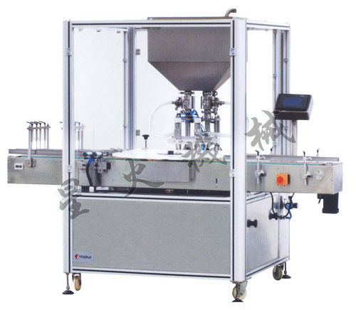 該膏霜自動灌裝生產線適合中黏度到高黏度的膏霜類物料,氣缸帶動活塞,兩個灌裝頭同時進行灌裝,星盤間歇轉動采用分割器傳動,定位精確,灌裝時容器底托的轉速/低速二段,可以穩定的對物料進行脫泡灌裝,灌裝部件結構是可以組裝和分解符合衛生標準確無準,具有無容器不灌裝功能.整機采用PLC控制方便簡單.