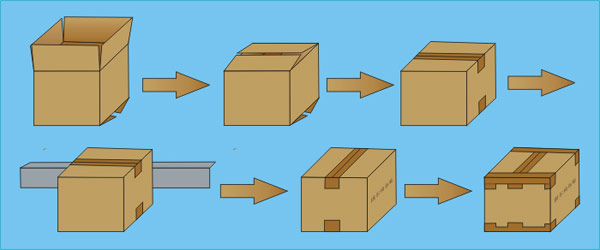 人工裝箱→自動折上蓋→上下封箱→自動推入→四角邊封箱→封箱完成(見下圖)